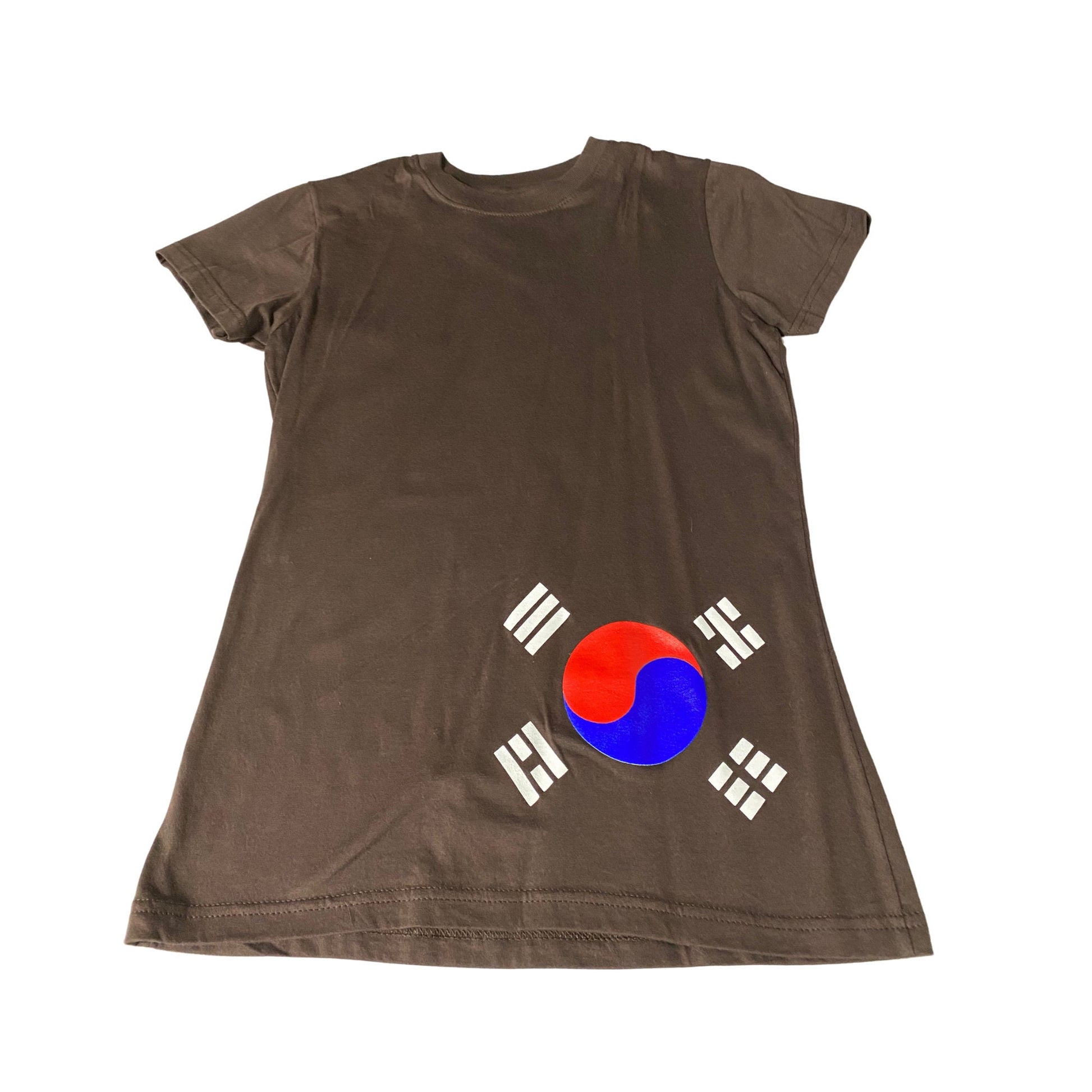 Adorable and super comfortable brown cotton tunic dress for girls featuring a silkscreened SOUTH KOREA Taegukgi FLAG silhouette. Yin and Yang. Korean Flag.