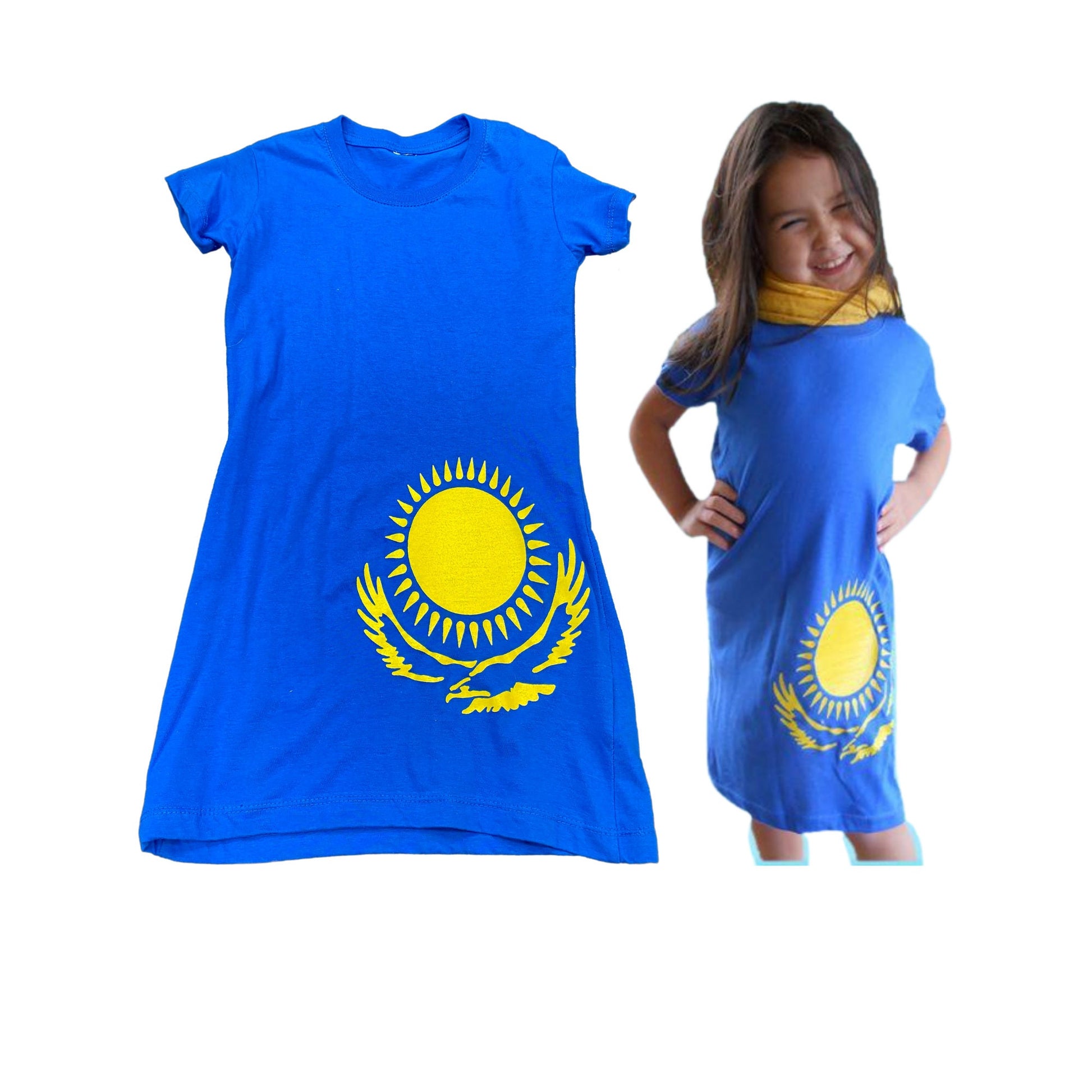 Adorable and super comfortable royal blue cotton tunic dress for girls featuring a silkscreened KAZAKHSTAN EAGLE AND SUN FLAG silhouette.
