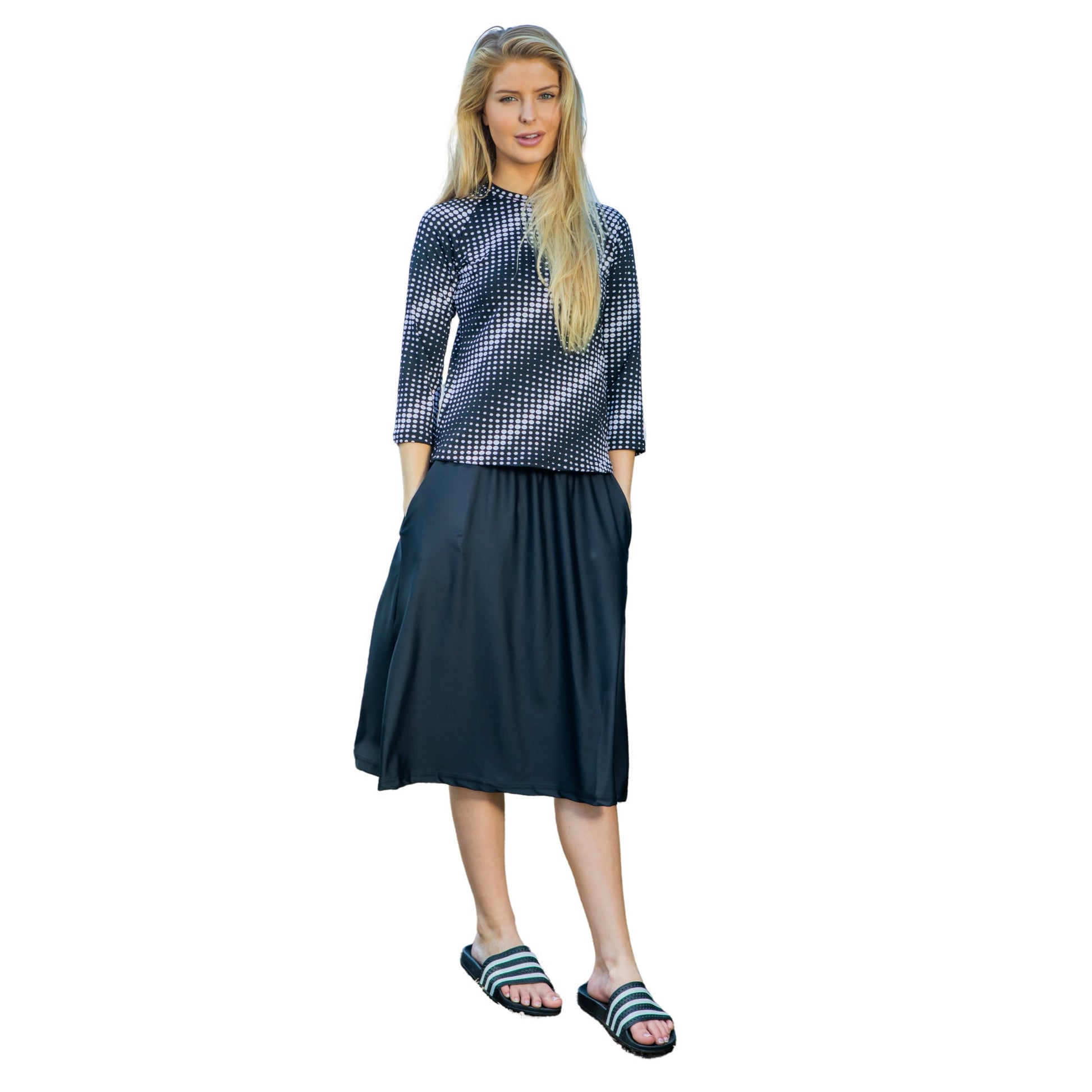 This below-the-knees swim and exercise skirt is perfect for the competitive athlete, weekend warrior, or woman who wants to go from beach or pool to the city. Our performance swim skirt gives you the comfort and confidence to do all the stretches and kicks necessary without exposing anything or riding up. Super stretchy with stretch recovery technology make this swim skirt perfect for swimmers, runners, yogis, athletes of all levels. 25".